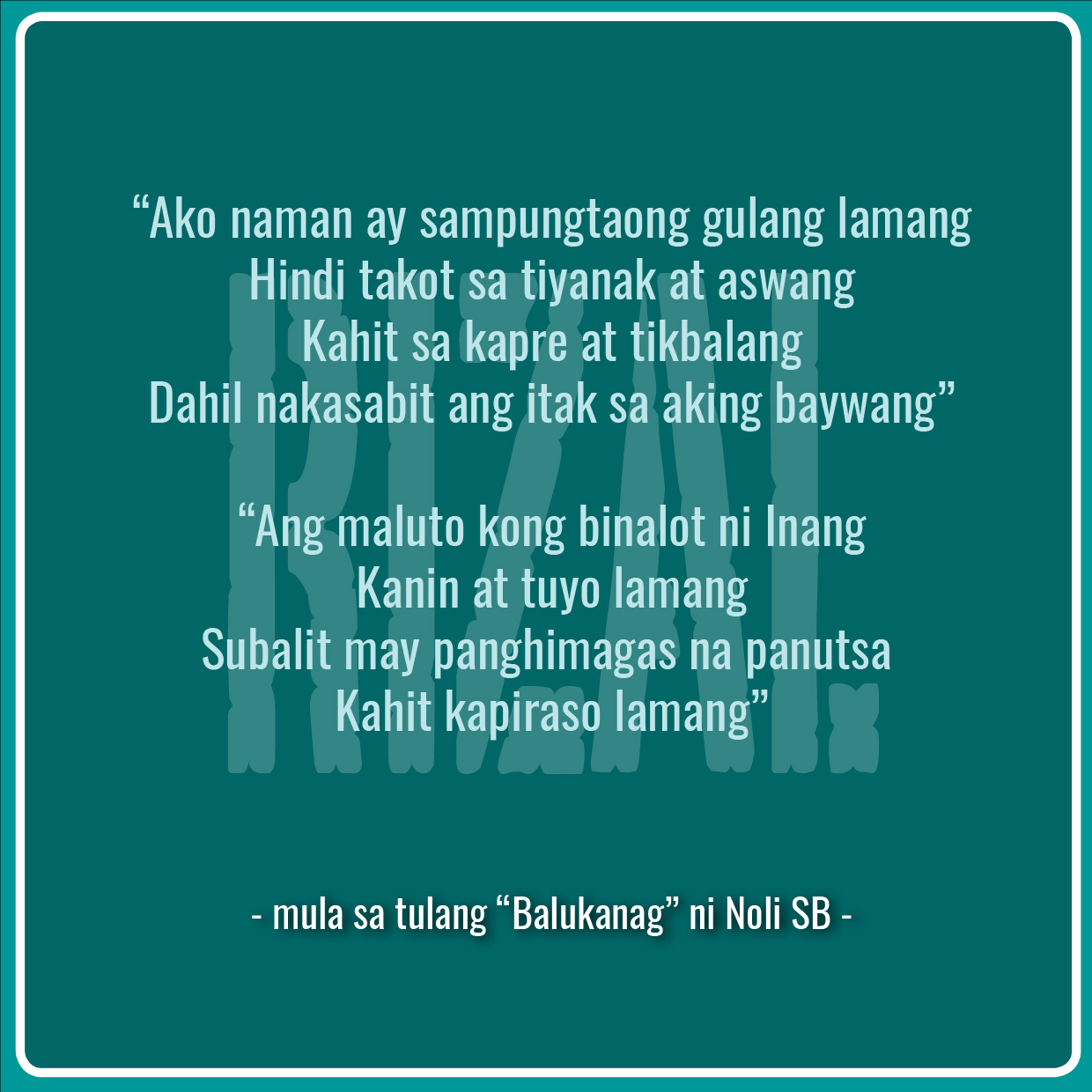 Punong manggang kinalabaw Ikaw ang aking pauusukan Susuubin nang maraming araw Tatabasan, lilinisin ang kapaligiran Iipunin, sisindihan at sa usok ay naglalayuan Ang mga ahas, lamok at mga pulang langgam Ako naman ay sampungtaong gulang lamang Hindi takot sa tiyanak at aswang Kahit sa kapre at tikbalang Dahil nakasabit ang itak sa aking baywang Ang maluto kong binalot ni Inang Kanin at tuyo lamang Subalit may panghimagas na panutsa Kahit kapiraso lamang May dalawang lingong araw-araw ay babalikan Muli`y sisindihan at kung may baga pa ay sapat nang ihipan Sa lilim ako`y nakahimlay, nangangarap ng masigabong putihan.